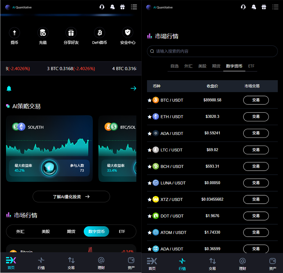 系统特点关键词:虚拟币外汇期货股票、AI量化、跟单组合理财、DEFI、策略等...